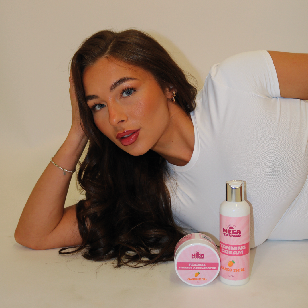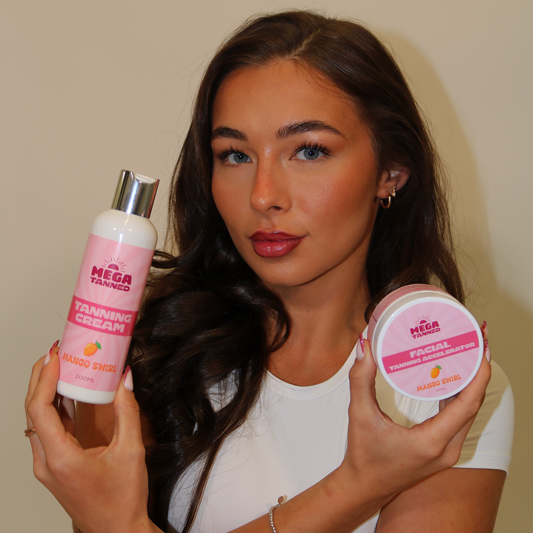 The Mega Tanned Mango Swirl Tanning Cream is a rich, hydrating tanning accelerator designed to help speed up your natural tanning process while deeply nourishing the skin. Infused with moisturising, skin-loving ingredients, this fast-absorbing, non-greasy formula helps support melanin production, allowing you to develop a deeper, longer-lasting tan in less time.