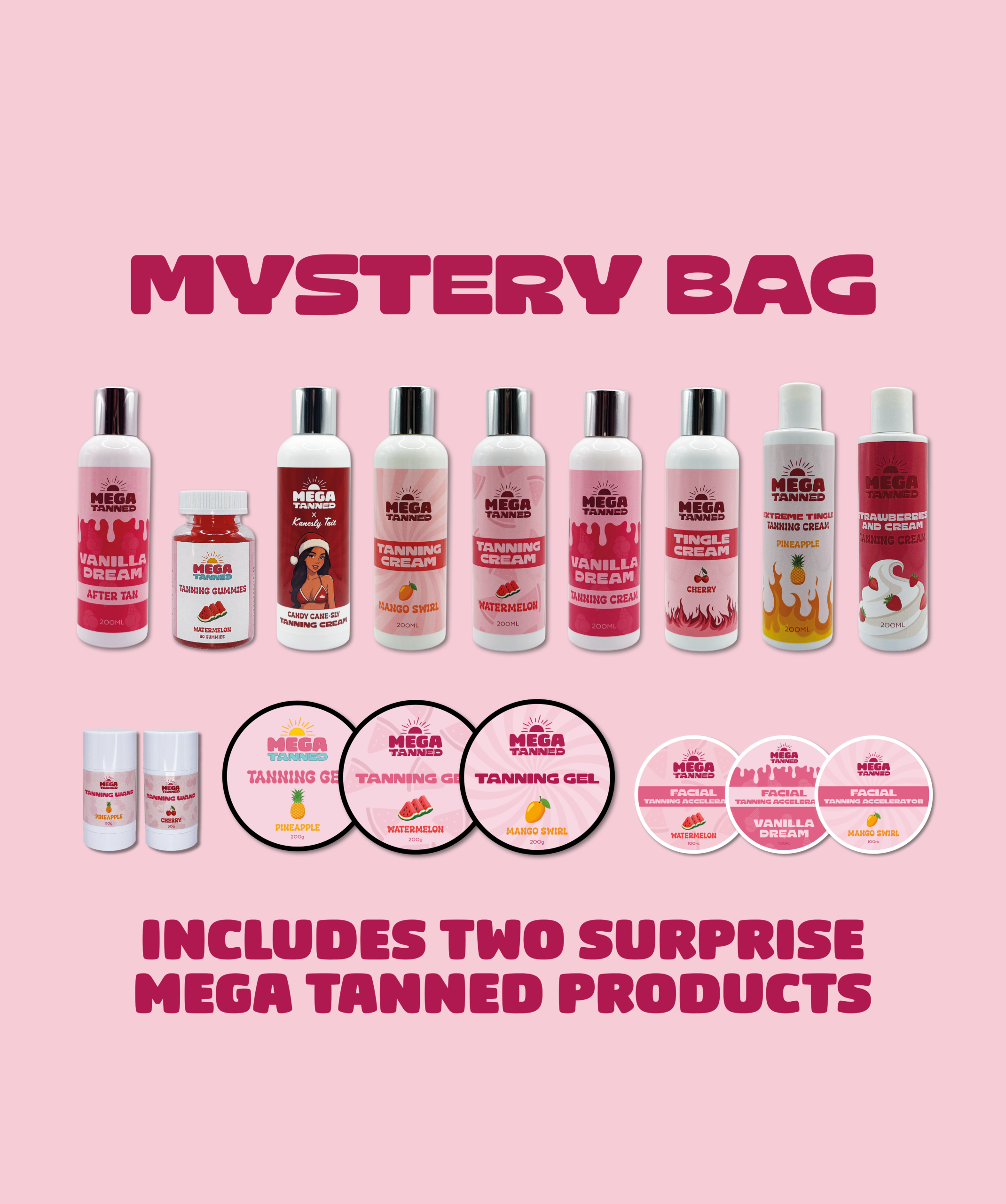 Each Mystery Bag contains two surprise products, selected from the Mega Tanned tanning and skincare range. Products may include: